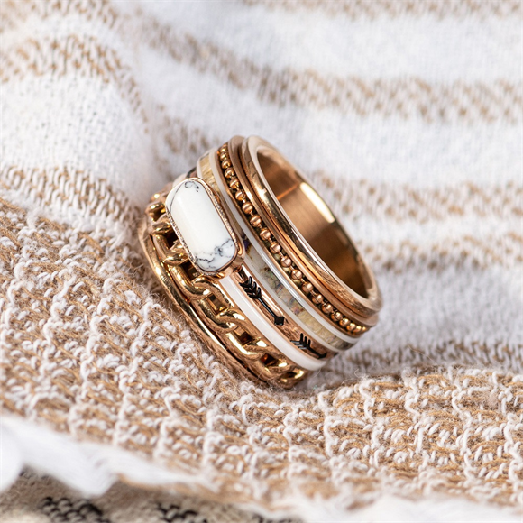De iXXXi vulring Festival White is een 2mm brede vulring gemaakt van stainless steel en is voorzien van een goudkleurige plating. Het design van de vulring bestaat uit een gladde ring voorzien van zwart kleurige, horizontale pijltjes rondom de ring. Bovenop is de ring voorzien van een horizontale, ovale vorm die aan de binnenkant gevuld is met een witkleurig, ovaalvormig, marmerlook gesteente. De ovale vorm heeft een diameter van 10 millimeter. De vulring Festival White is verkrijgbaar in de maten 15 t/m 21 en valt met zijn maat 15 en 16 ook onder onze XS-collectie. De iXXXi Jewelry XS-collectie is speciaal gemaakt voor iXXXi fans met smalle vingers. Je kunt deze vulringen ook naast jouw iXXXi ringcombinatie als solitaire ringen dragen.